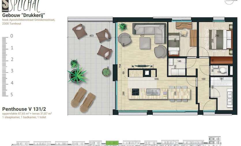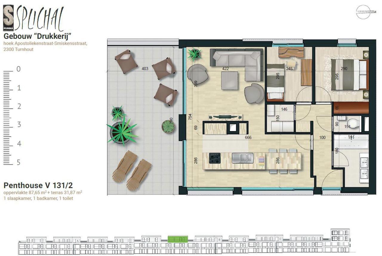Gelegen op de tweede verdieping (bereikbaar met lift of trap) beschikt dit dakappartement over een bewoonbare oppervlakte van ca. 88 m². U komt binnen via een inkomhal met gastentoilet. De ruime, volledig uitgeruste eetkeuken en de lichtrijke living geven beiden uit op het zonnige terras — ideaal voor ontbijt in de ochtendzon of een aperitief in de avond.