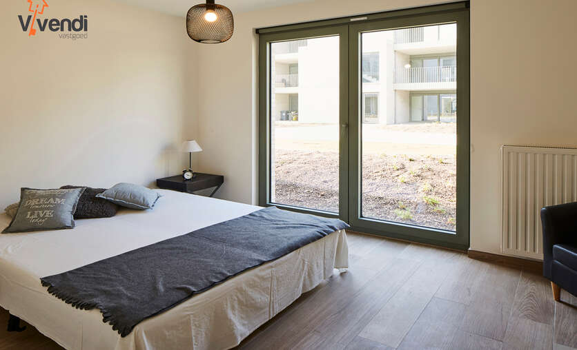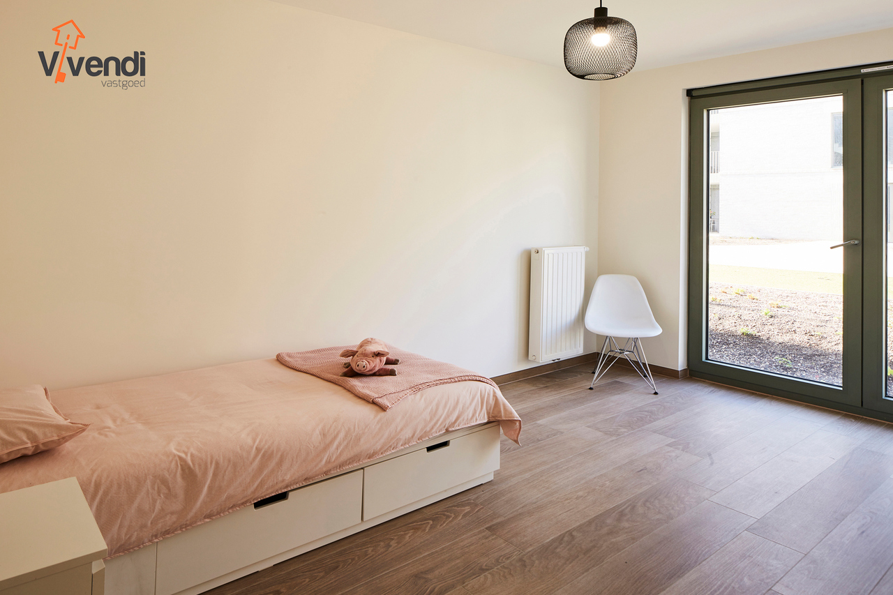 Instapklaar en energiezuinige gelijkvloerse appartement met 2 ruime slaapkamers, een zonnig terras, 1 ondergrondse autostaanplaats en 1 privatieve kelder- en fietsenberging.