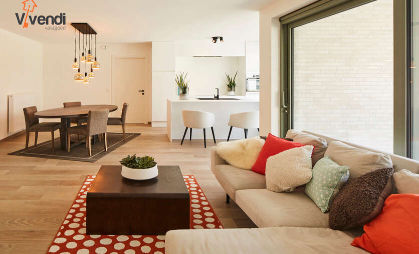 Via de inkomhal betreden we de ruime leefruimte, die dankzij de grote raampartijen baadt in natuurlijk daglicht. De open keuken is volledig uitgerust met moderne toestellen zoals een vaatwasser, oven, inductiekookplaat met dampkap, koelkast en spoelbak. De nachthal geeft toegang tot twee volwaardige slaapkamers. De badkamer is stijlvol afgewerkt en beschikt over een dubbele lavabo, ruime inloopdouche en voldoende opbergruimte. Daarnaast is er een praktische wasplaats/berging met aansluiting voor wasmachine en droogkast. Op het aangename terras geniet u vanaf de middag van de zon dankzij de gunstige oriëntatie – ideaal om te ontspannen. De ondergrondse parkeergarage is bereikbaar via de trappenhal en biedt naast de autostaanplaats ook voldoende ruimte voor (bak)fietsen en zelfs motoren. Bovendien beschikt het appartement over een ruime privatieve kelderberging. Verkoop onder BTW-stelsel, 6% BTW mogelijk (indien u aan de voorwaarden voldoet).