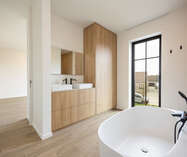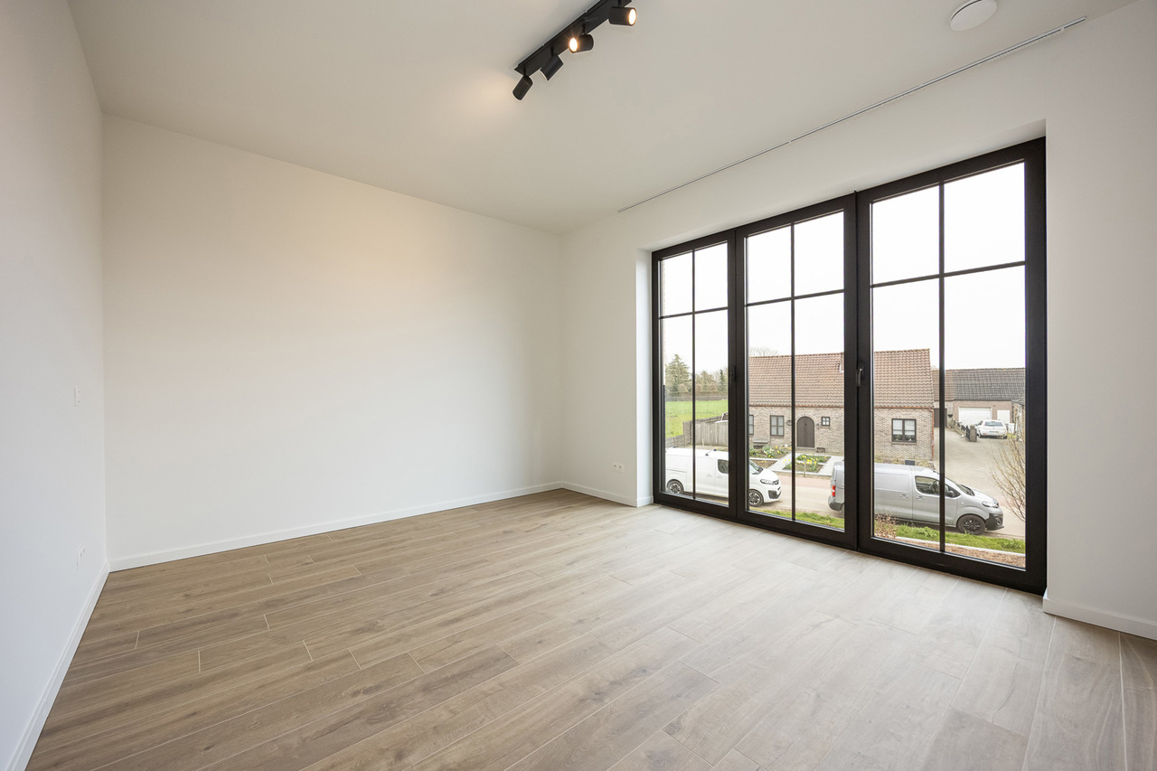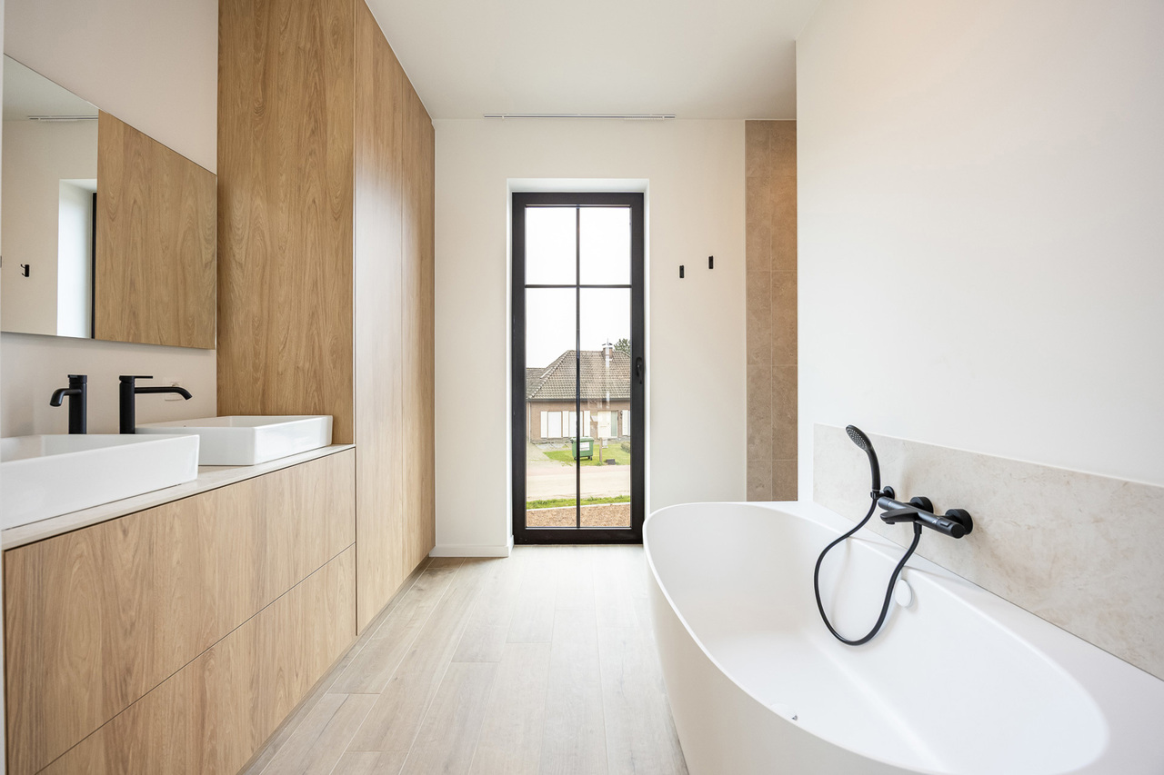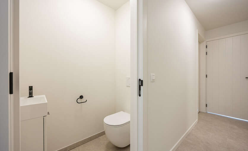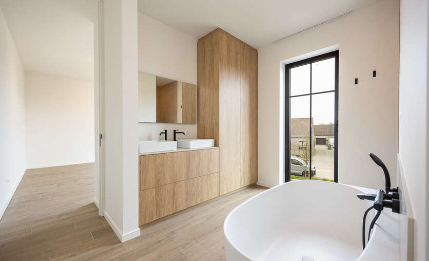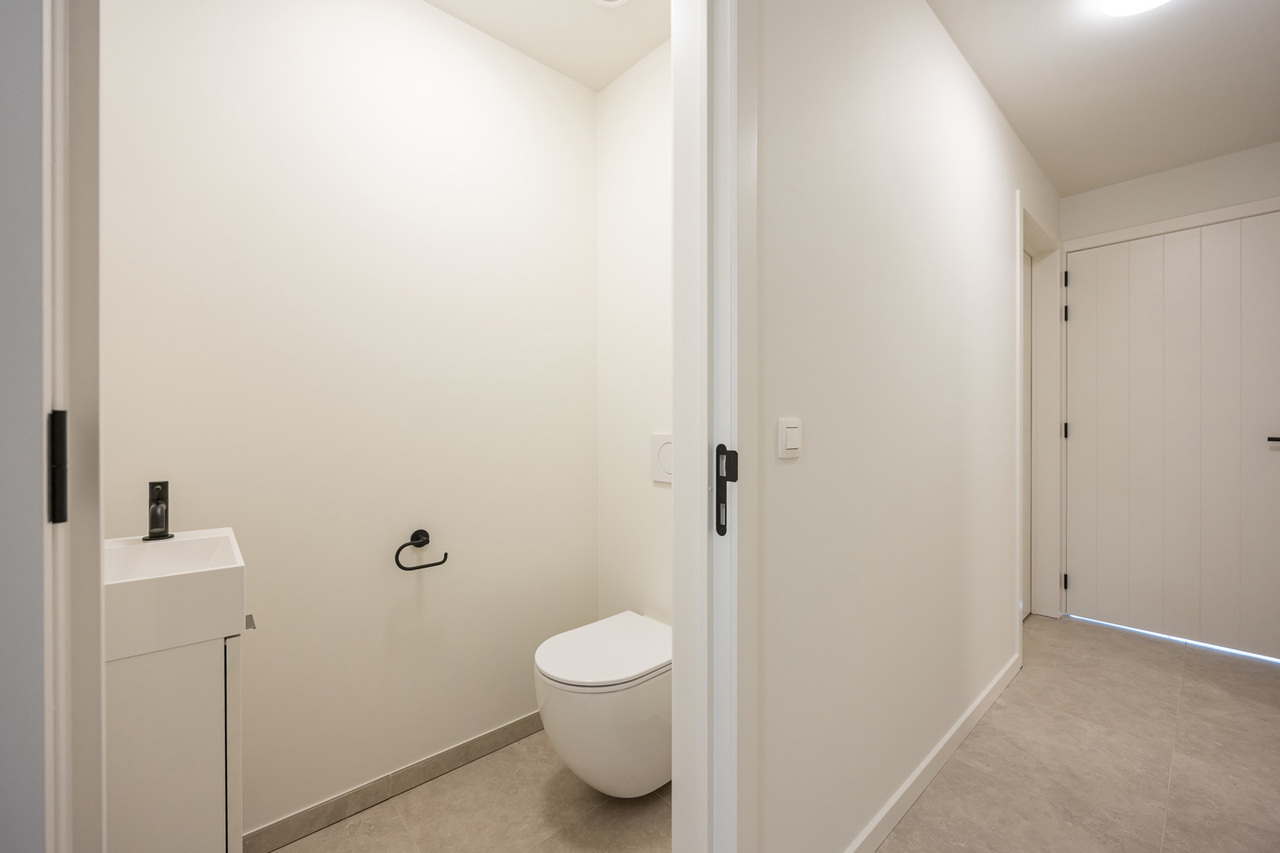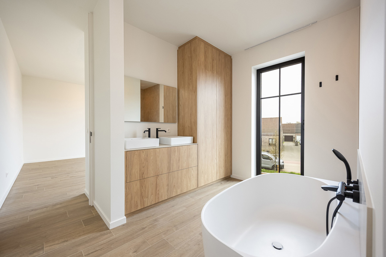 Eerste verdieping; Royale hal met gastentoilet, Hoogwaardig afgewerkte eetkeuken met proviandkast, Ruime, lichtrijke living, Groot terras met prachtig uitzicht, Mastersuite met riante slaapkamer en volledig ingerichte badkamer, Ruime wasplaats.